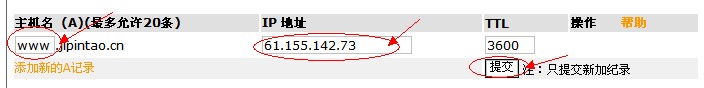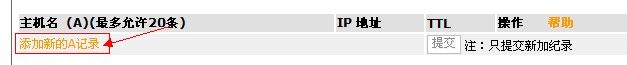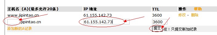 主机名(A)点击“添加新的A记录”,设置为“www”、“*”或空,“IP地址”中输入您的空间IP地址,然后“提交”,设置完一般需要6-72小时生效即可!